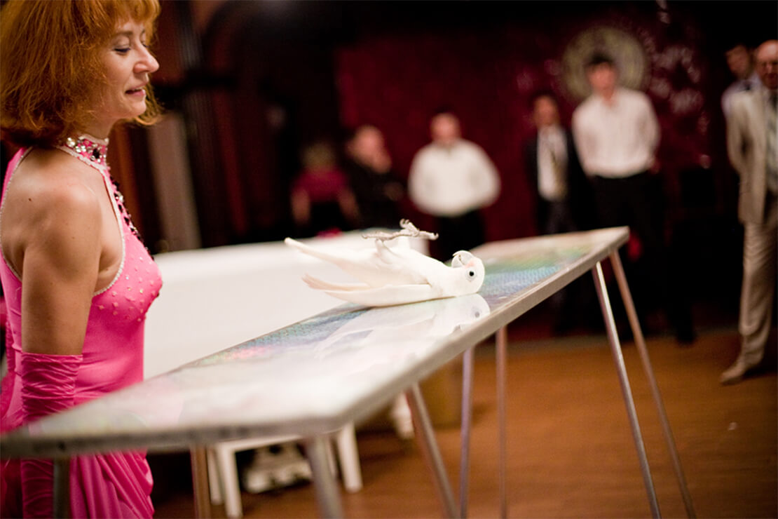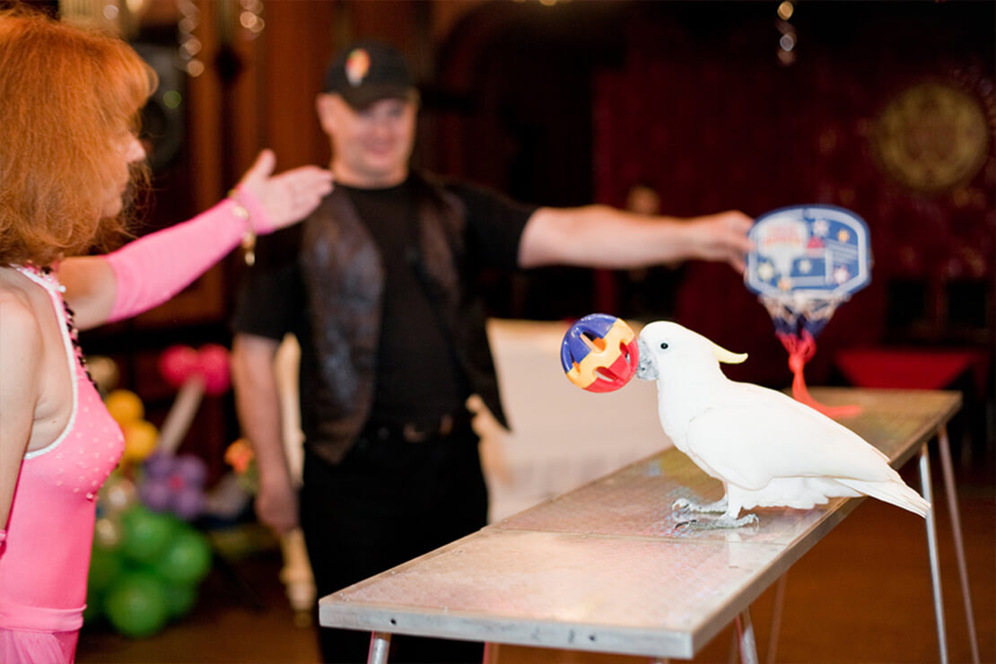 Белоснежные пернатые артисты всегда вызывают восторг у зрителей разных возрастов! Они с легкостью преодолевают препятствия, любят раскачиваться на кольцах, кататься на велосипеде и забивать мячи в баскетбольную корзину! А происходит все это под пристальным присмотром голубовато-желтого попугая, который тоже не против поиграть в баскетбол!