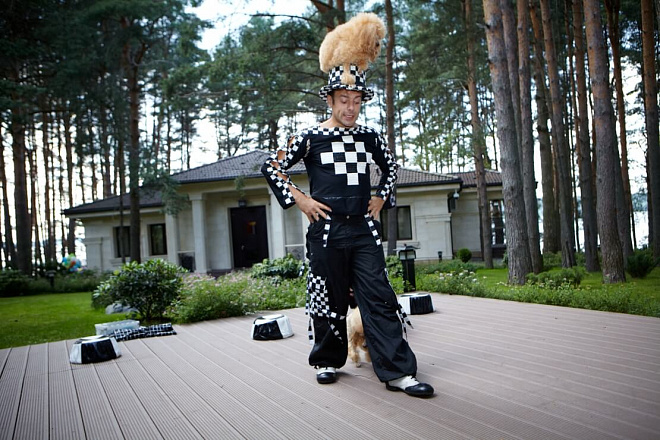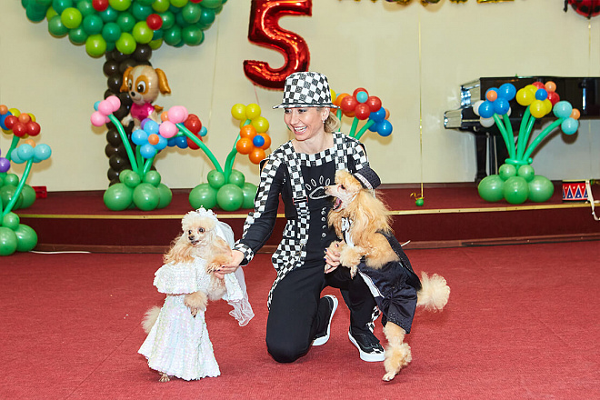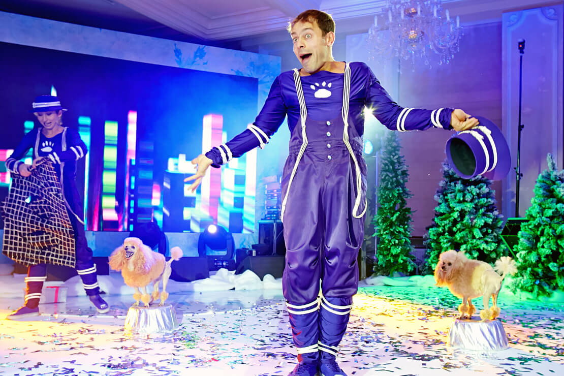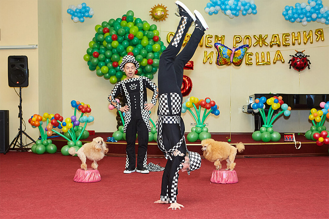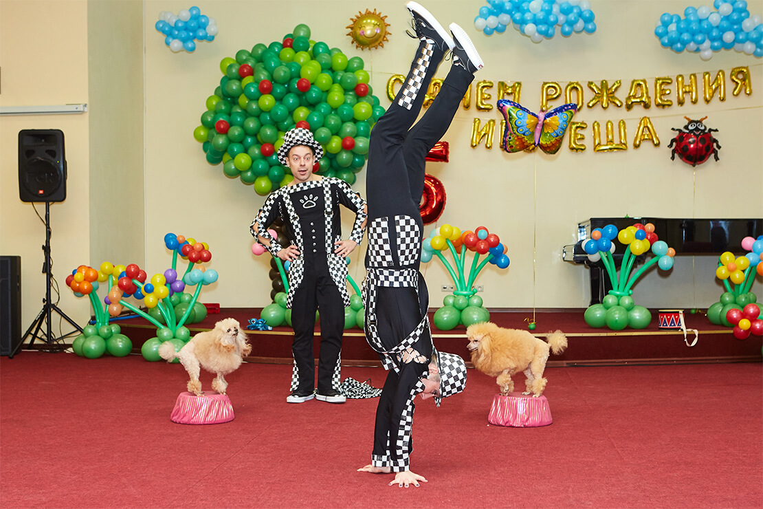 Два симпатичных рыжих пуделя с радостью исполняют разнообразные трюки. Как бы соревнуясь между собой, они делают акробатические элементы совместно со своими дрессировщиками, весьма подвижными и эксцентричными. Собачки прыгают через кольцо, выполняют стойки, крутят пируэты и все это действо заканчивается собачьей свадьбой. Они уезжают со сцены, наряженные женихом и невестой на блестящем кабриолете!