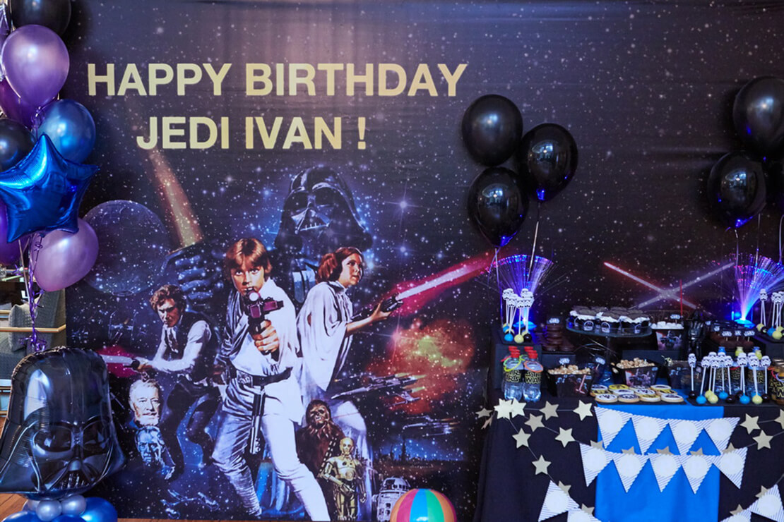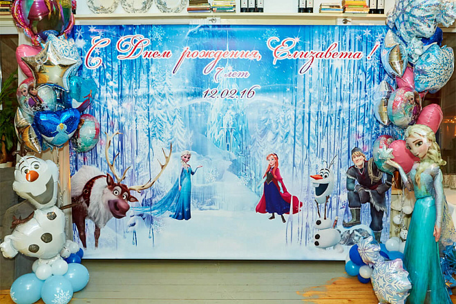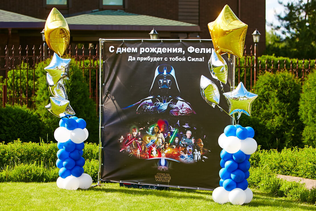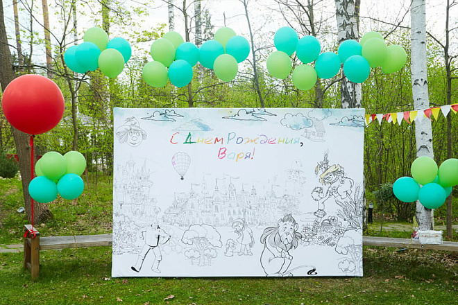 Оформление праздника с помощью тематического баннера – это отличная организация запоминающейся фотозоны. Добавьте к ней воздушные шары или сделайте огромную раскраску с пожеланиями от гостей!