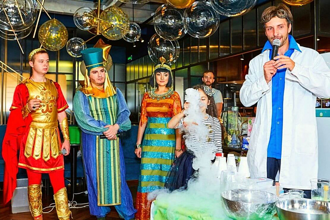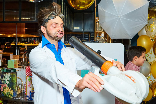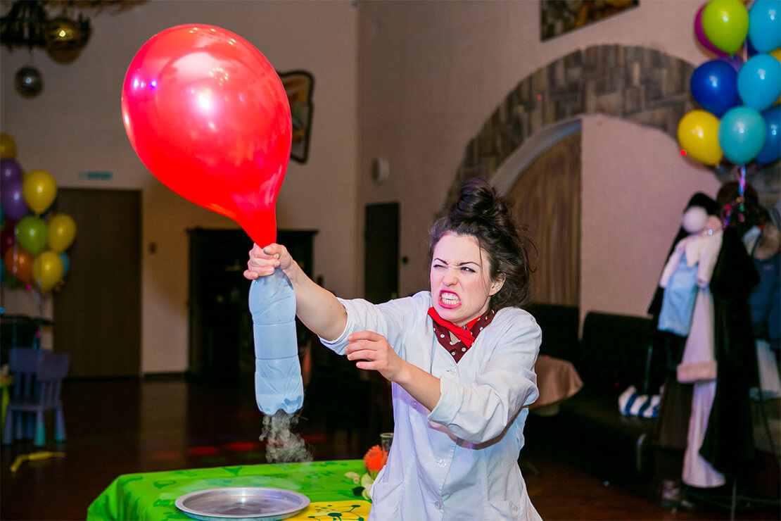 Шоу сумасшедшего профессора – это буйство самых разнообразных химических и физических экспериментов, которые удивят и детей, и взрослых! Забавный учёный зажигает электрическую лампочку без розетки и батареек, показывает, что может произойти с воздушным шаром, если его заморозить жидким азотом.
