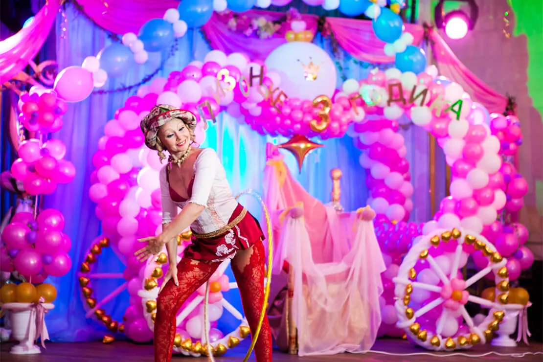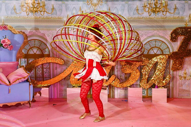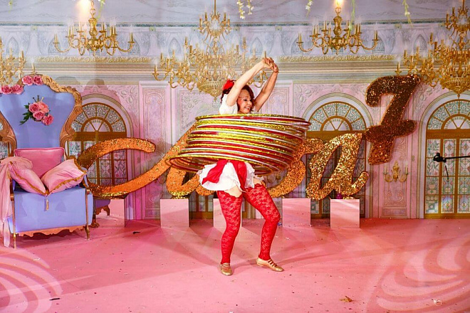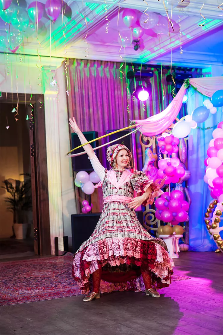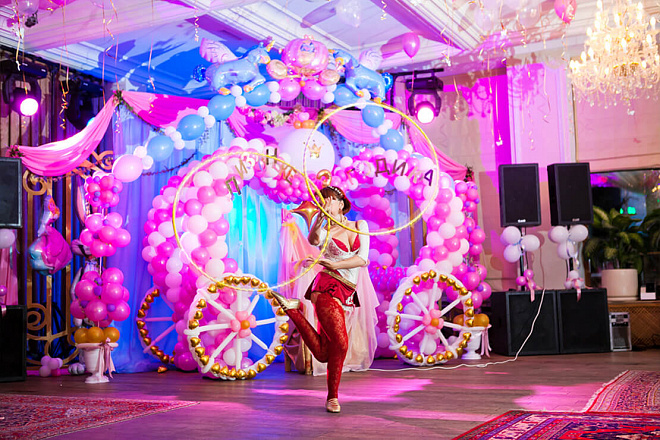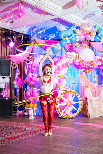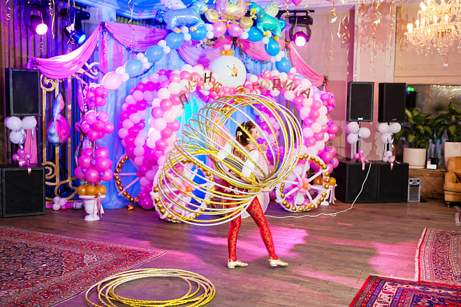 Оригинальный номер «Кукла» – это смесь танцевального и акробатического жанров. Вы увидите мастерство вращения обручей от одного до большого множества, а также оцените чудеса перевоплощения! Номер с хула-хупами станет настоящим украшением вашего праздника.