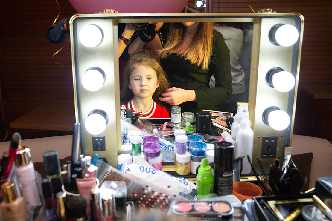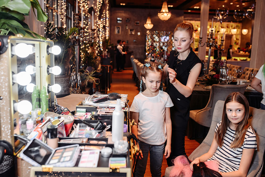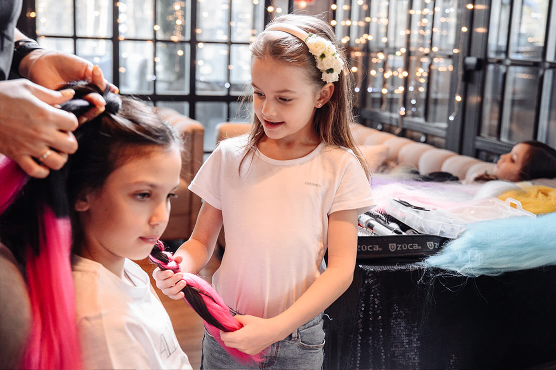 Наши мастера с удовольствием сделают маленьким принцессам праздничный макияж, романтичную укладку и даже разноцветные невероятные пряди и хвосты.
