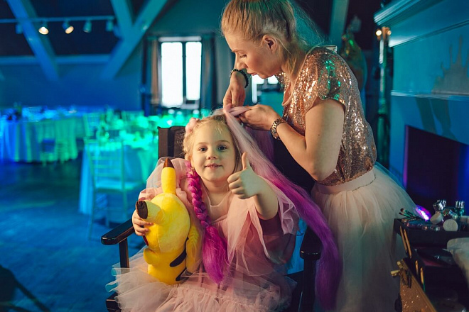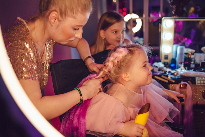 Подготовка к празднику – дело важное и ответственное. Потому для маленьких звёзд мы предлагаем настоящий выездной салон: умелые мастера делают гостям удивительные причёски, заплетают косички и готовят к выходу в свет в лучшем виде!