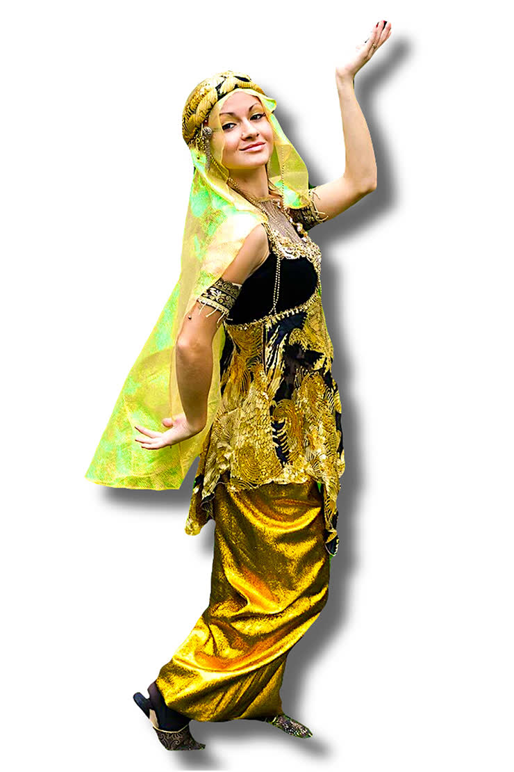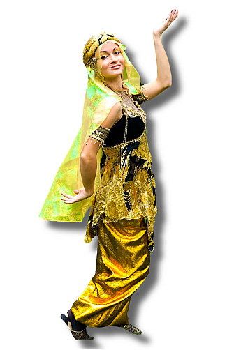 В комплект входит: платок, обруч, топик, шаровары, украшения.