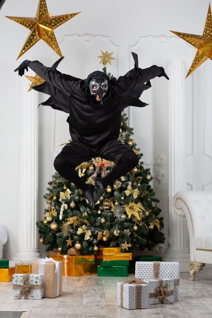 Но герои сказки пришли не одни, за ними всю дорогу следили вороны. В разгар веселья раздаётся скрип, скрежет и в центре зала неожиданно появляется Снежная Королева со своими воронами. Она оскорблена, что её не пригласили на праздник!